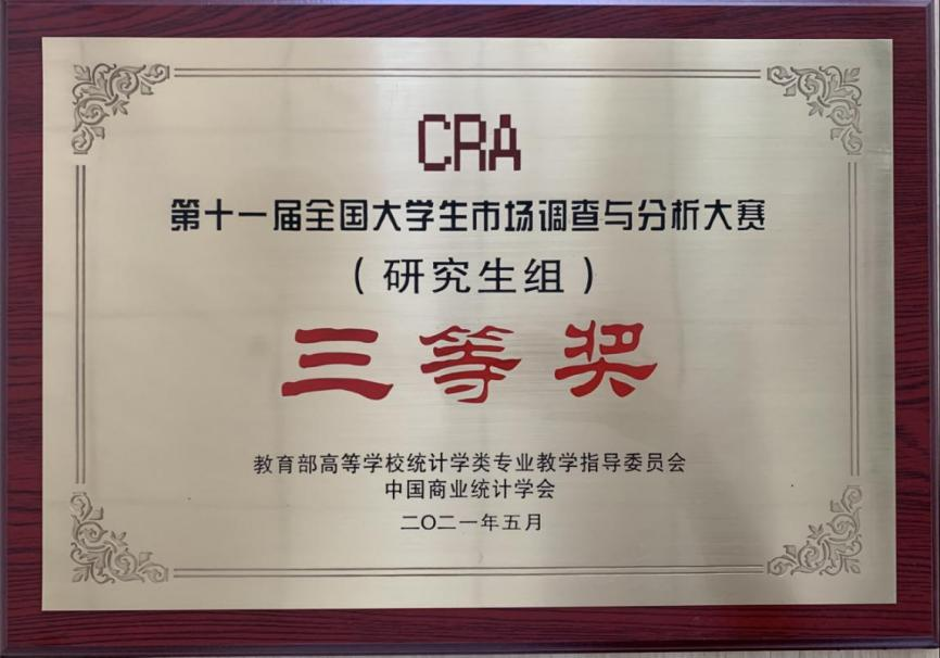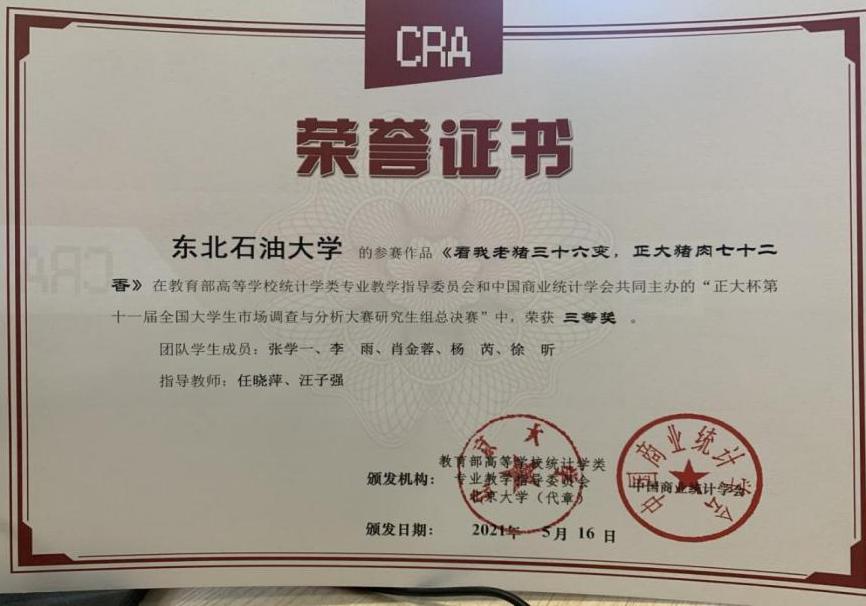 2021年5月,“正大杯”第十一届全国大学生市场调查与分析大赛(以下简称“大赛”)研究生赛区落下帷幕。在金牌导师任晓萍、汪子强老师的带领下,我院研究生组在大赛中一路过关斩将,荣获全国三等奖,参赛队伍成员分别为:张学一、李雨、肖金荣、杨芮。