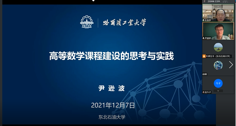 尹逊波教授作了题为《高等数学课程建设的思考与实践》专题讲座,通过分析国内高校高等数学课程设置情况,介绍哈尔滨工业大学该课程具体设置及历史沿革;通过介绍哈尔滨工业大学数学类一流课程建设、大学数学课程教材建设、数学教学团队建设等方面的介绍,讲解现阶段数学类课程建设和教学改革的切入点和具体方式方法;并提出期望与我校开展合作的愿望。