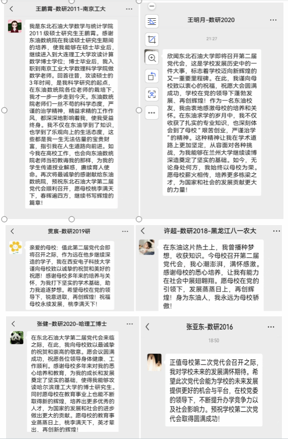 在研究生培养方面,近三年有近20%的研究生考上了兰州大学、东北大学、西安电子科技大学、南京农业大学、哈尔滨理工大学、2138cc太阳集团等知名高校的博士研究生。已经毕业的研究生有多名扎根在黑龙江省各基层单位为龙江经济建设贡献自己的青春和热血,也有奋斗在南京工业大学、上海工程技术大学、黑龙江八一农垦大学、大庆师范学院等高校和大庆市团委、大庆市各中学等单位,扎根在教育第一线为祖国培育建设者和接班人,他们一直在努力践行大庆精神铁人精神,用实际行动诠释“身在最北方,心向党中央”,将自己的青春邵华奉献给龙江的发展建设。悉知学校即将召开第二届党代会,他们纷纷送上了真诚的祝福。